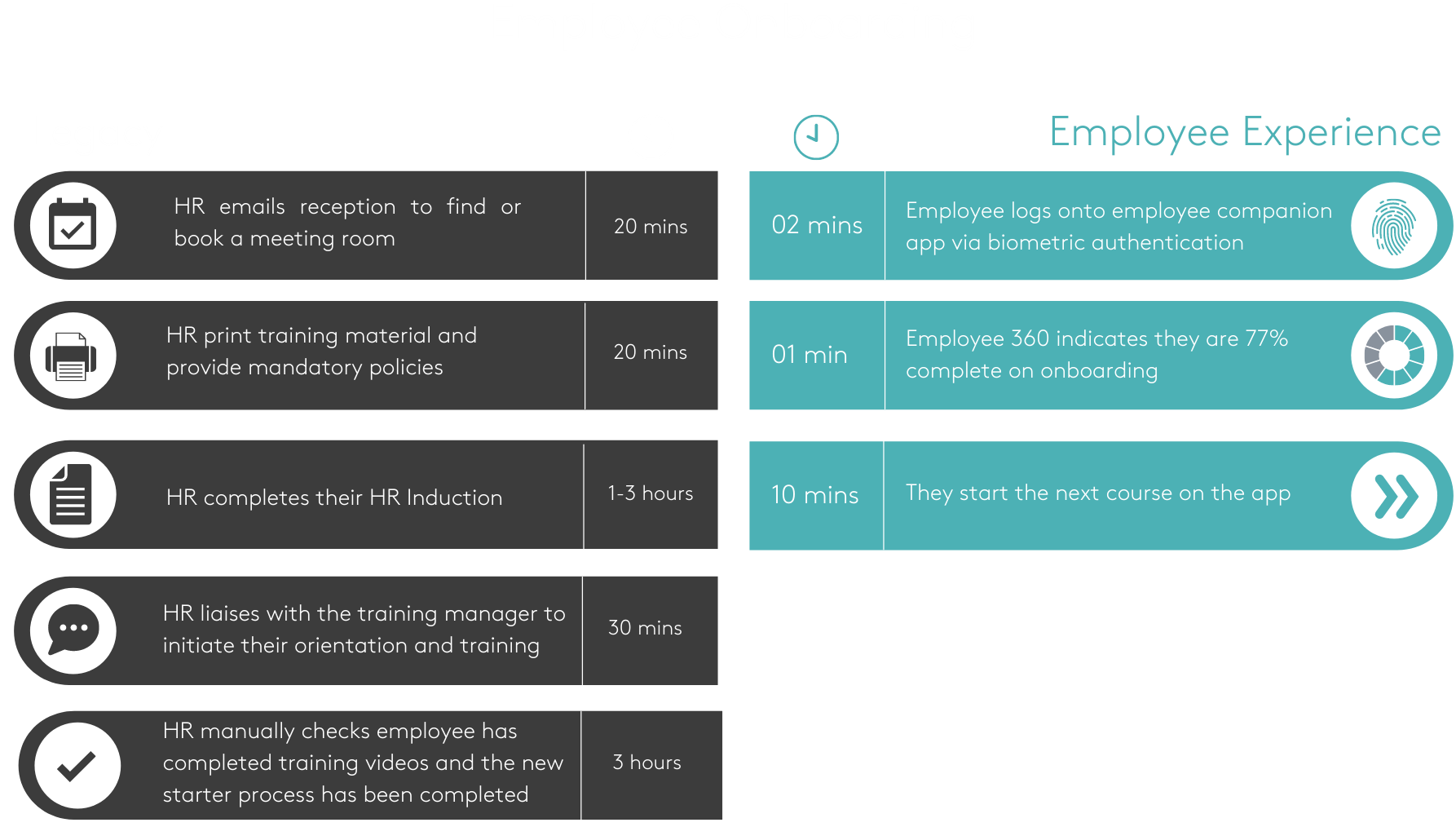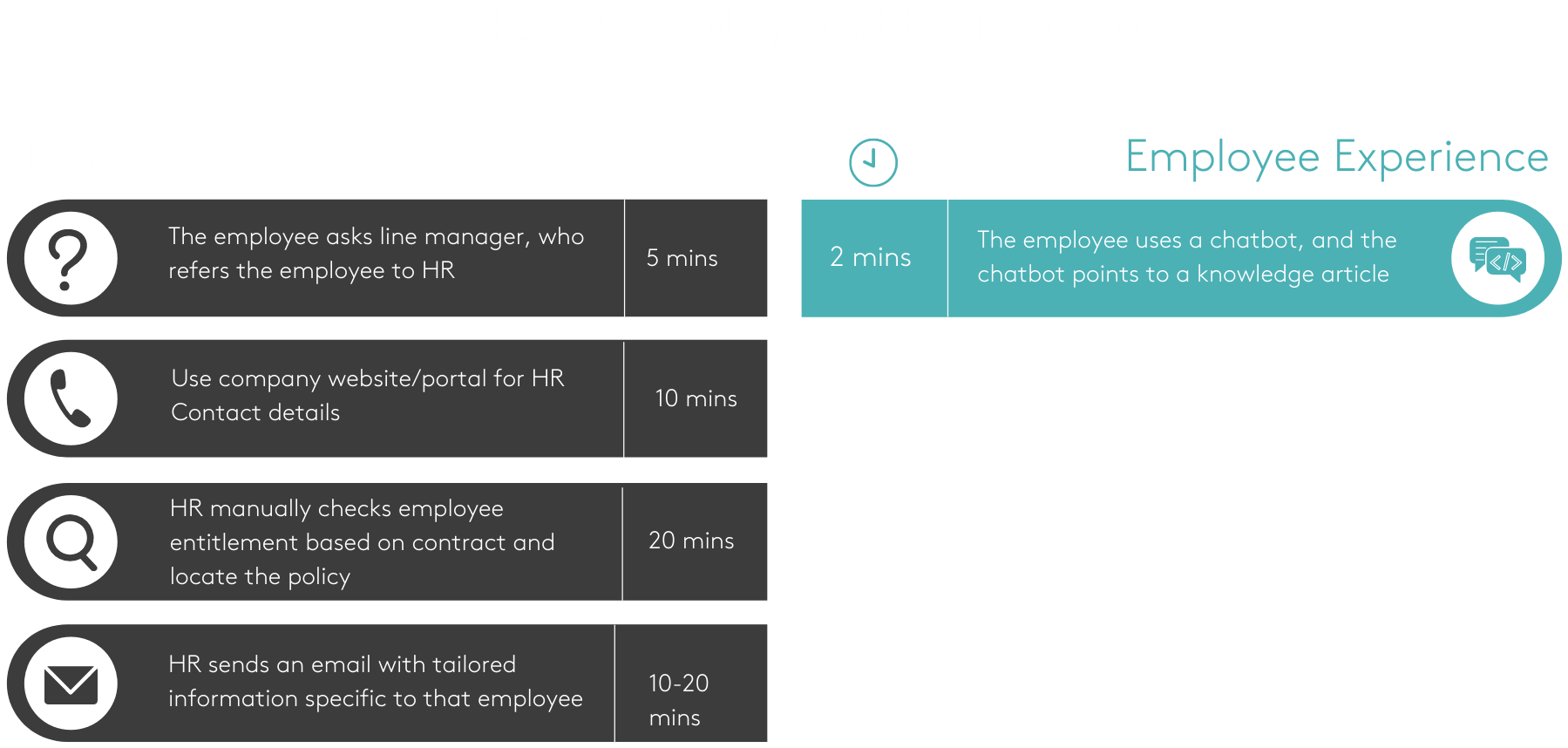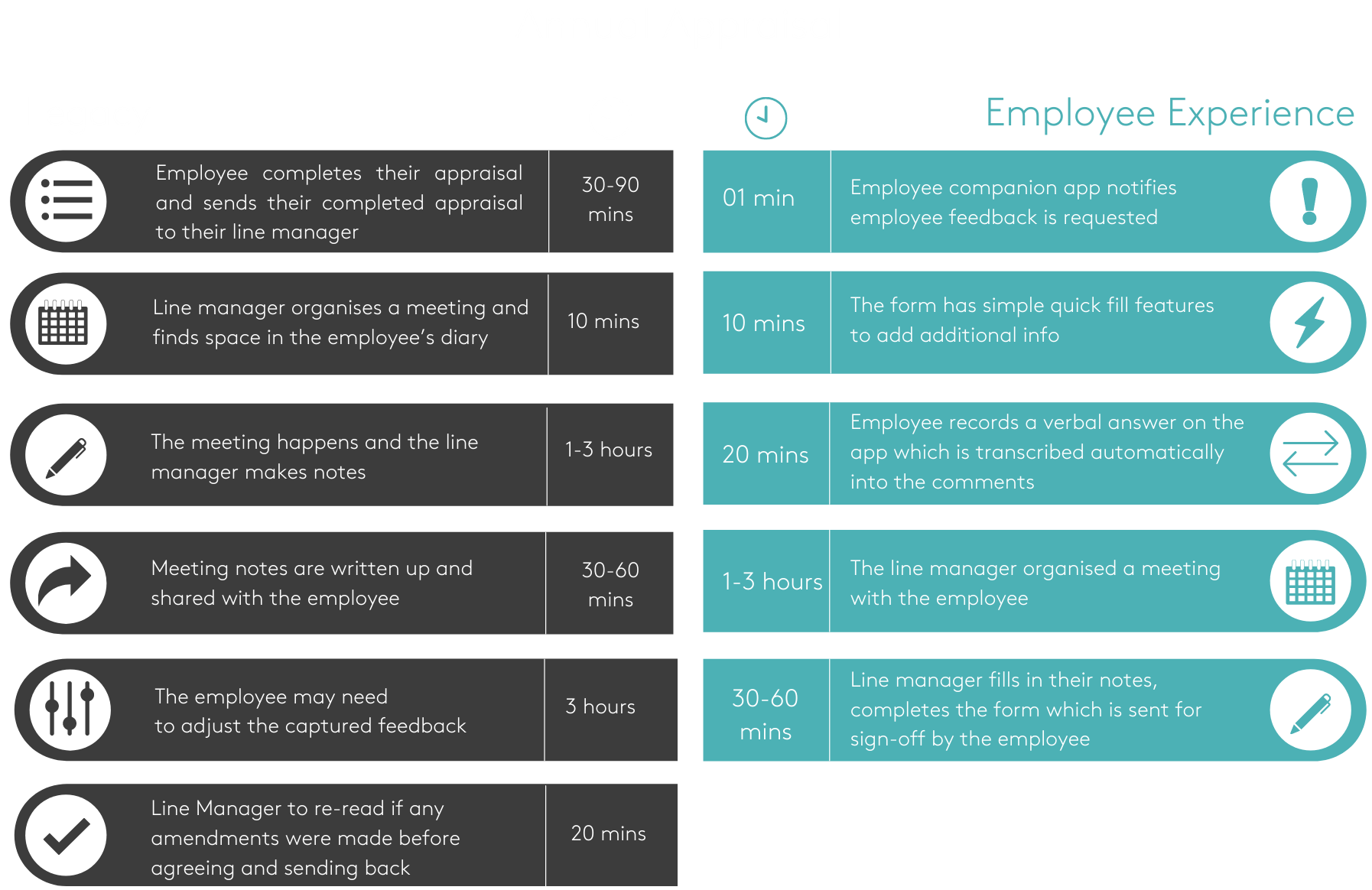 We can visualise the simplicity of good employee interactions by comparison of the user journey with and without Employee Self Service enhancements: